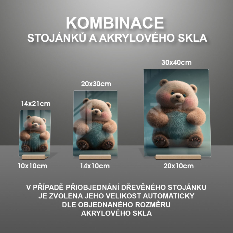 Na produktovém fotu vyobrazena nejoblíbenější varianta akrylového skla 14x21/21x14cm a dřevěný stojánek 10x10cm.
