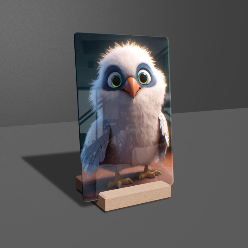 Na produktovém fotu vyobrazena nejoblíbenější varianta akrylového skla 14x21/21x14cm a dřevěný stojánek 10x10cm.