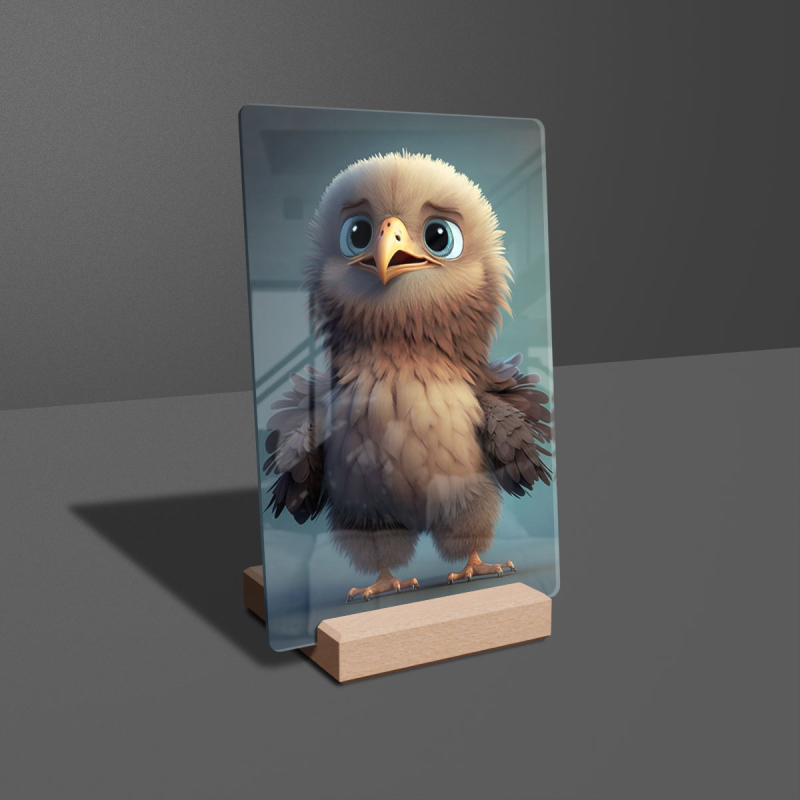 Na produktovém fotu vyobrazena nejoblíbenější varianta akrylového skla 14x21/21x14cm a dřevěný stojánek 10x10cm.