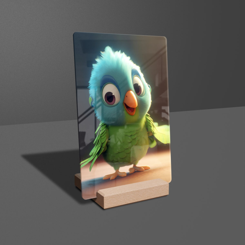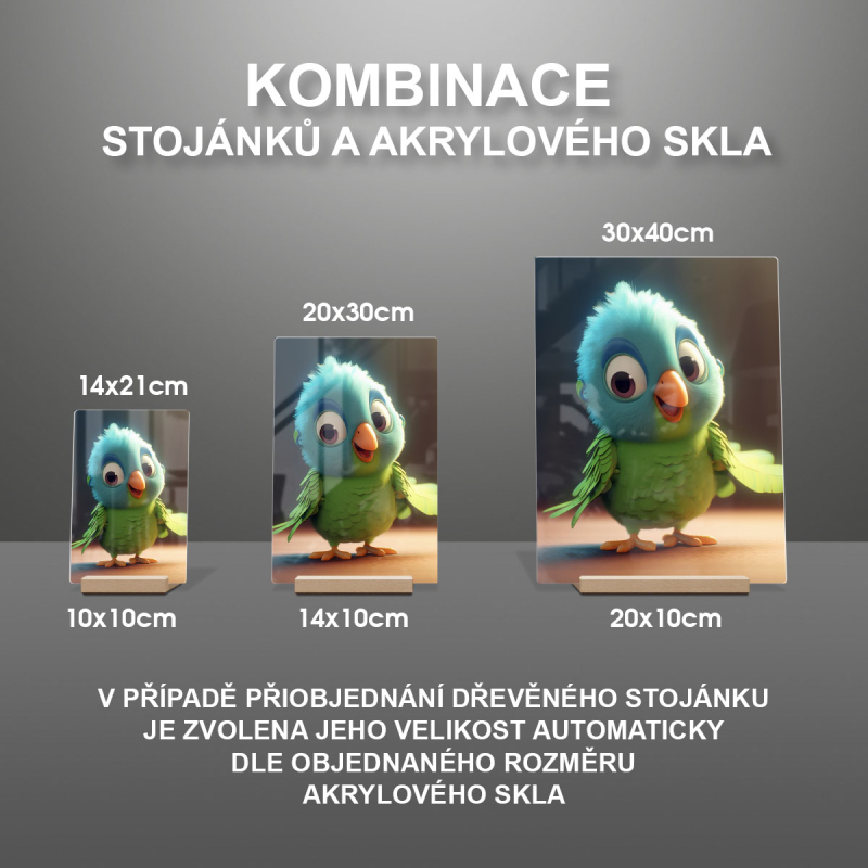 Na produktovém fotu vyobrazena nejoblíbenější varianta akrylového skla 14x21/21x14cm a dřevěný stojánek 10x10cm.
