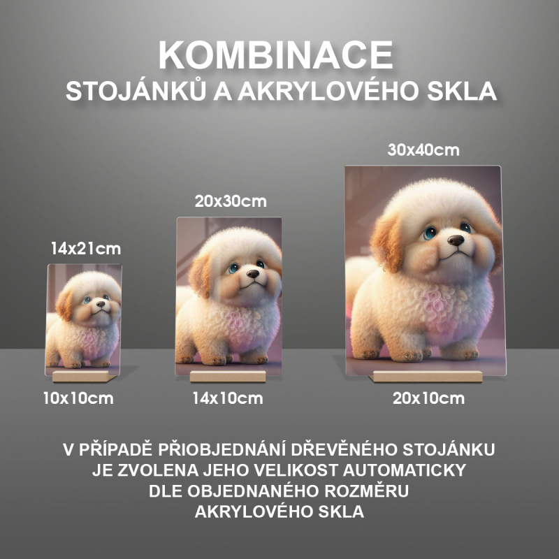 Na produktovém fotu vyobrazena nejoblíbenější varianta akrylového skla 14x21/21x14cm a dřevěný stojánek 10x10cm.