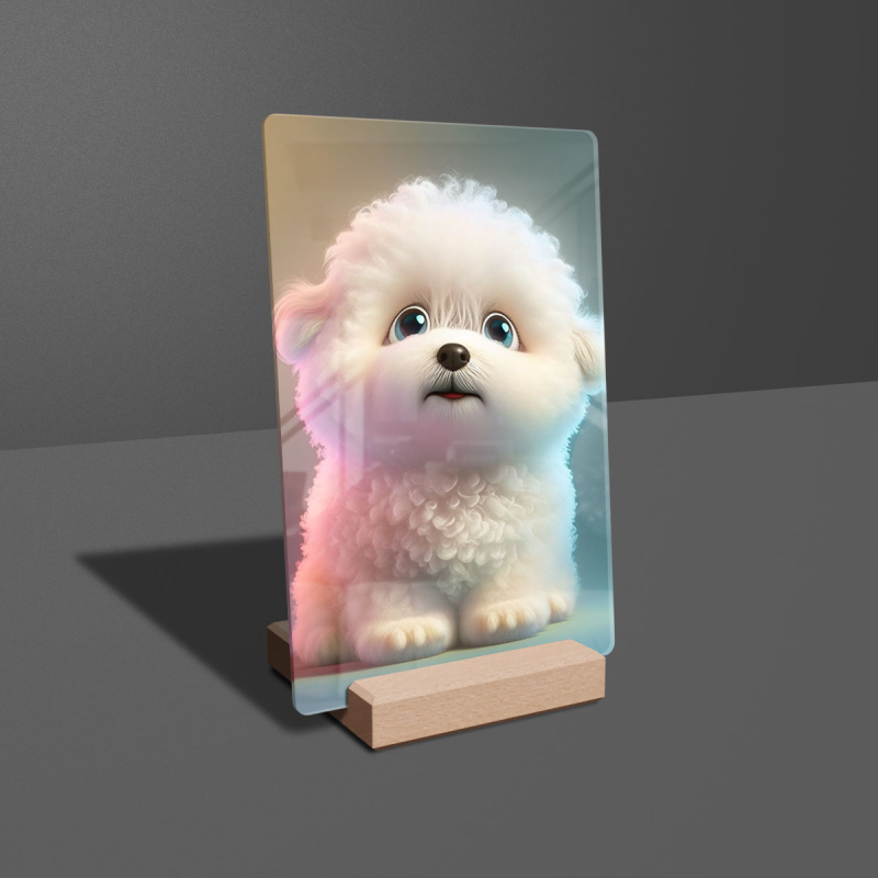 Na produktovém fotu vyobrazena nejoblíbenější varianta akrylového skla 14x21/21x14cm a dřevěný stojánek 10x10cm.