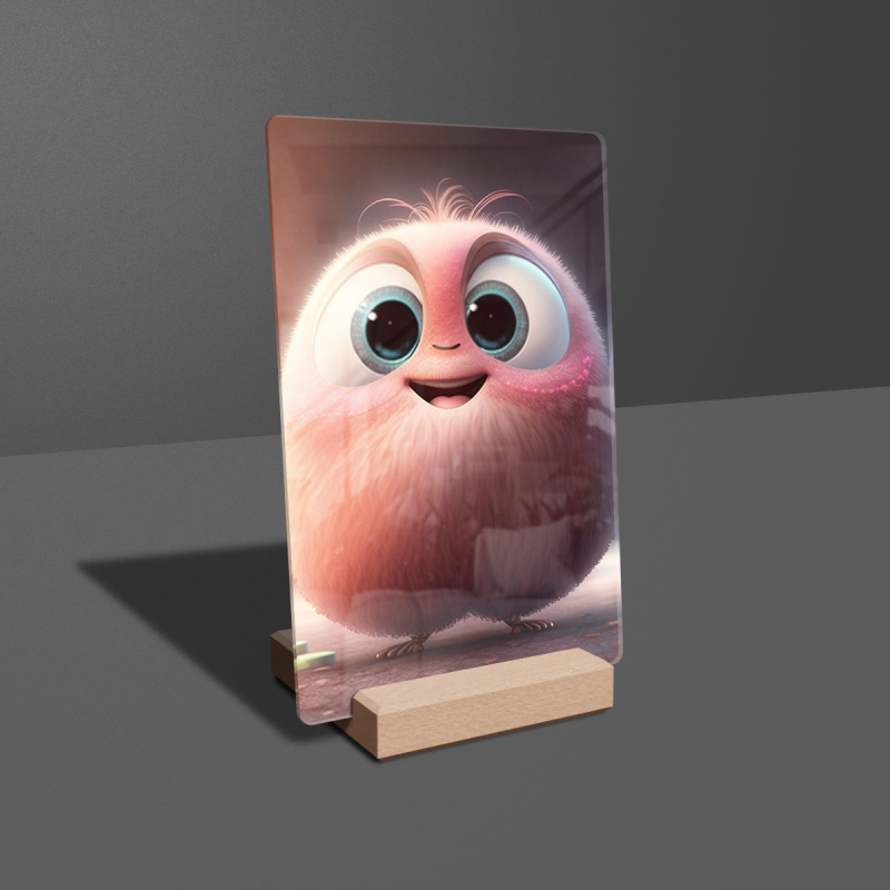 Na produktovém fotu vyobrazena nejoblíbenější varianta akrylového skla 14x21/21x14cm a dřevěný stojánek 10x10cm.