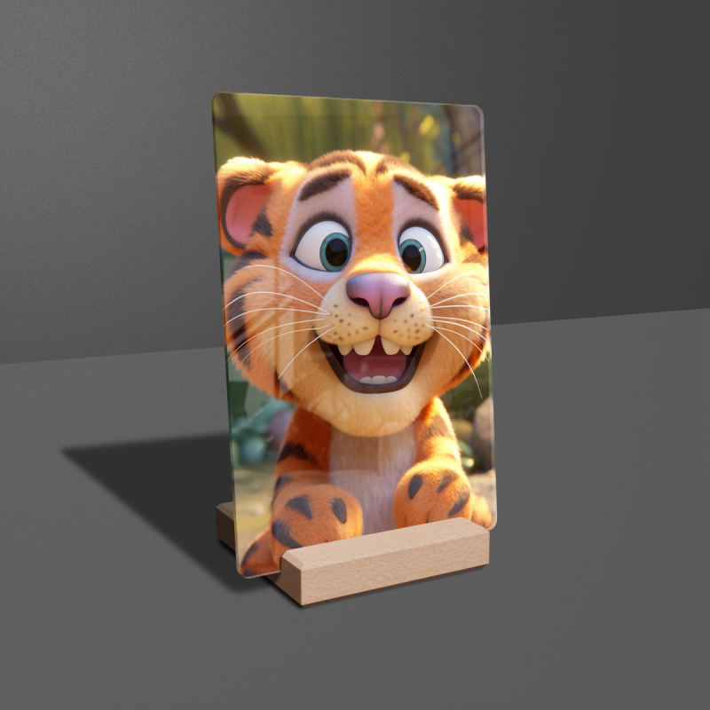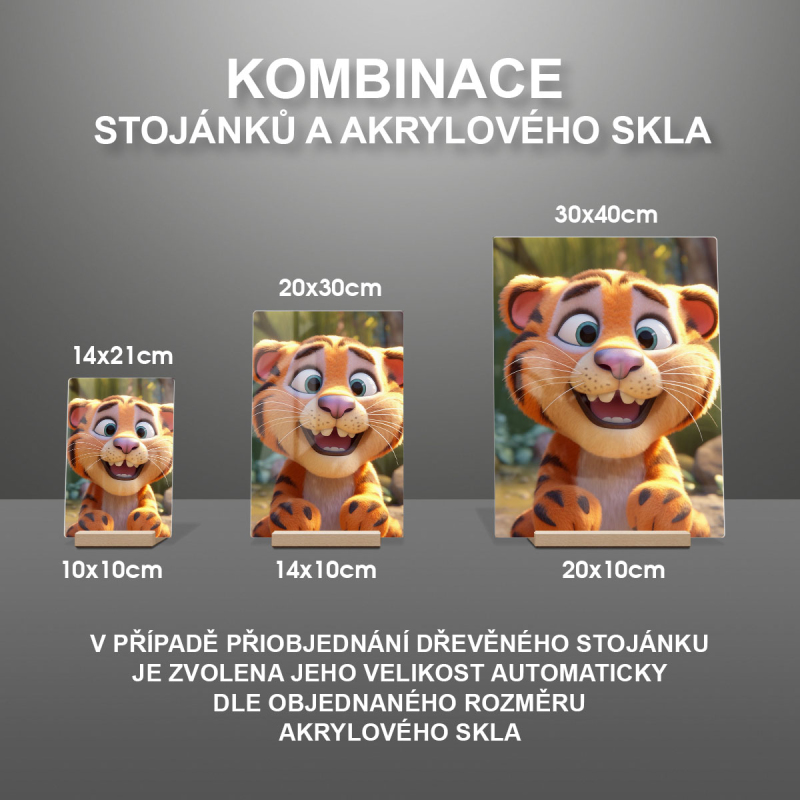 Na produktovém fotu vyobrazena nejoblíbenější varianta akrylového skla 14x21/21x14cm a dřevěný stojánek 10x10cm.