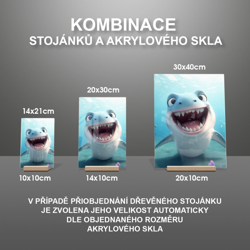 Na produktovém fotu vyobrazena nejoblíbenější varianta akrylového skla 14x21/21x14cm a dřevěný stojánek 10x10cm.
