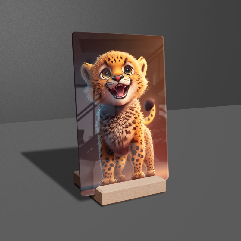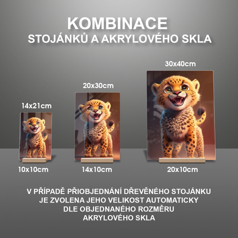 Na produktovém fotu vyobrazena nejoblíbenější varianta akrylového skla 14x21/21x14cm a dřevěný stojánek 10x10cm.
