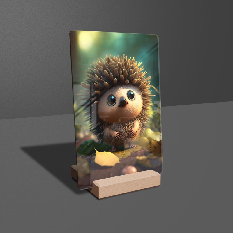 Na produktovém fotu vyobrazena nejoblíbenější varianta akrylového skla 14x21/21x14cm a dřevěný stojánek 10x10cm.