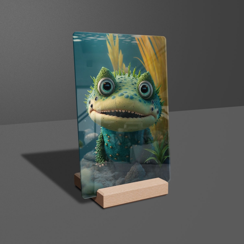 Na produktovém fotu vyobrazena nejoblíbenější varianta akrylového skla 14x21/21x14cm a dřevěný stojánek 10x10cm.