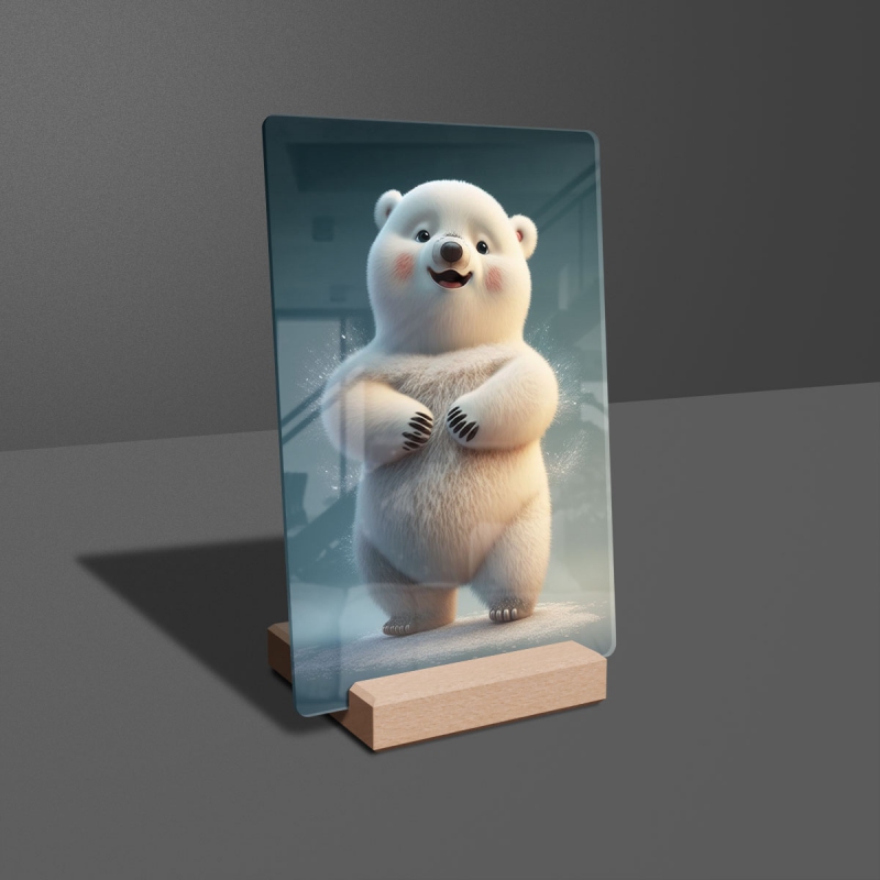 Na produktovém fotu vyobrazena nejoblíbenější varianta akrylového skla 14x21/21x14cm a dřevěný stojánek 10x10cm.