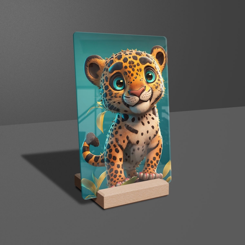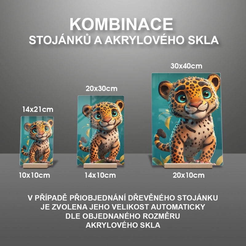 Na produktovém fotu vyobrazena nejoblíbenější varianta akrylového skla 14x21/21x14cm a dřevěný stojánek 10x10cm.