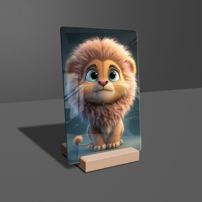 Na produktovém fotu vyobrazena nejoblíbenější varianta akrylového skla 14x21/21x14cm a dřevěný stojánek 10x10cm.