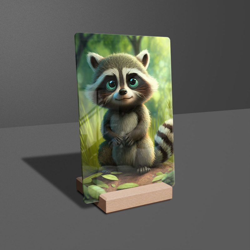 Na produktovém fotu vyobrazena nejoblíbenější varianta akrylového skla 14x21/21x14cm a dřevěný stojánek 10x10cm.