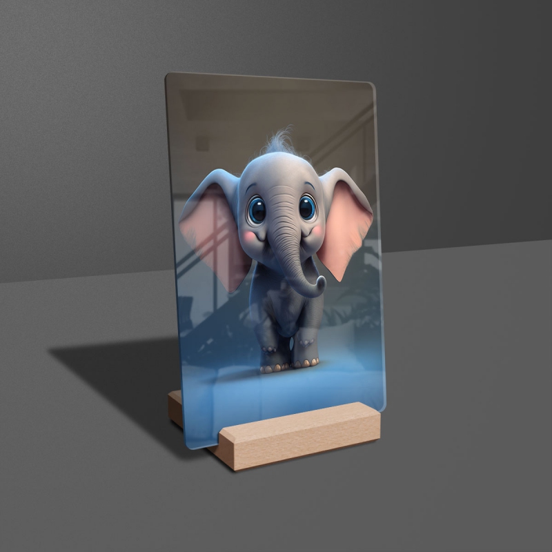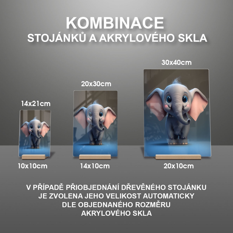 Na produktovém fotu vyobrazena nejoblíbenější varianta akrylového skla 14x21/21x14cm a dřevěný stojánek 10x10cm.