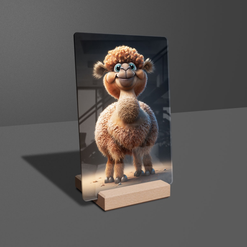 Na produktovém fotu vyobrazena nejoblíbenější varianta akrylového skla 14x21/21x14cm a dřevěný stojánek 10x10cm.