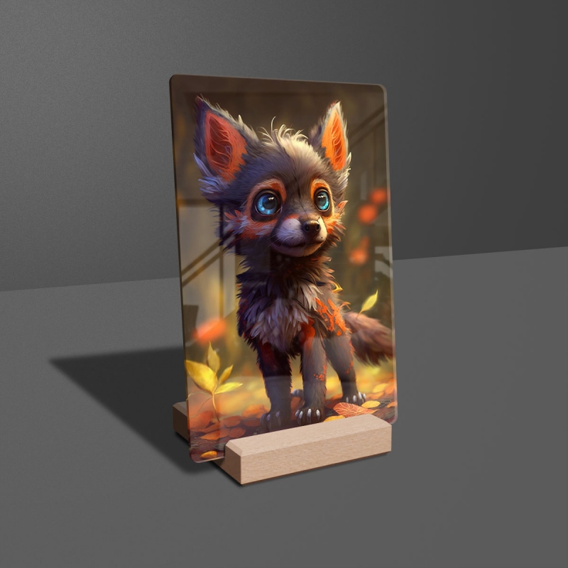 Na produktovém fotu vyobrazena nejoblíbenější varianta akrylového skla 14x21/21x14cm a dřevěný stojánek 10x10cm.