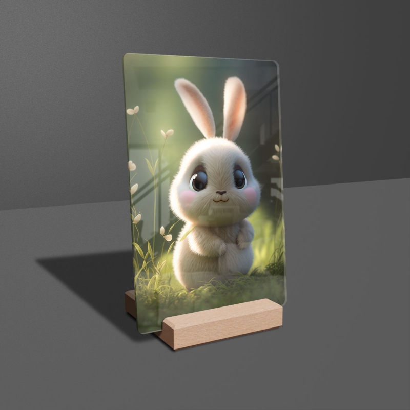 Na produktovém fotu vyobrazena nejoblíbenější varianta akrylového skla 14x21/21x14cm a dřevěný stojánek 10x10cm.