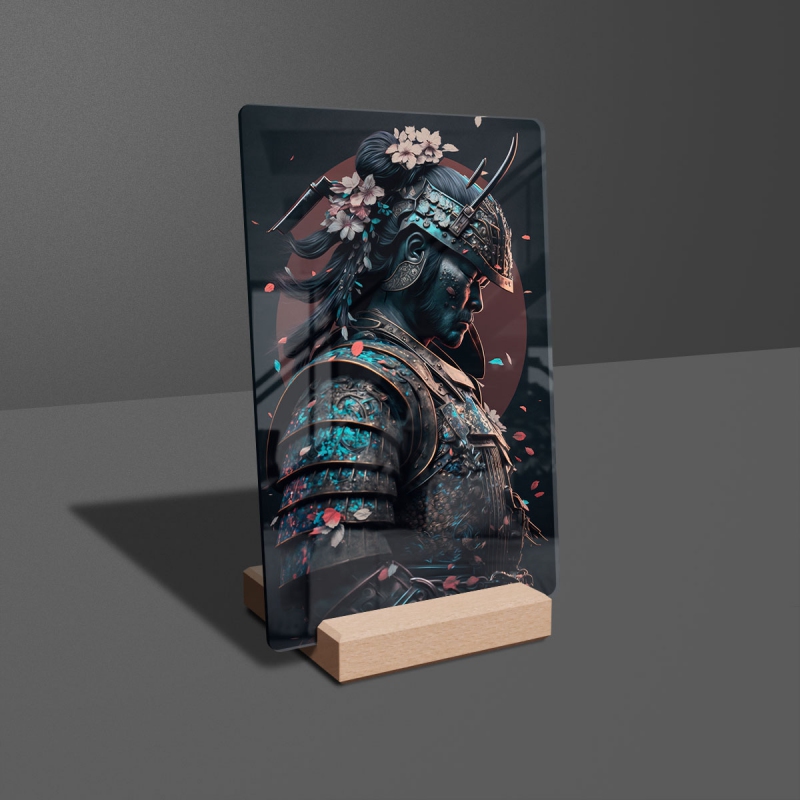 Na produktovém fotu vyobrazena nejoblíbenější varianta akrylového skla 14x21/21x14cm a dřevěný stojánek 10x10cm.