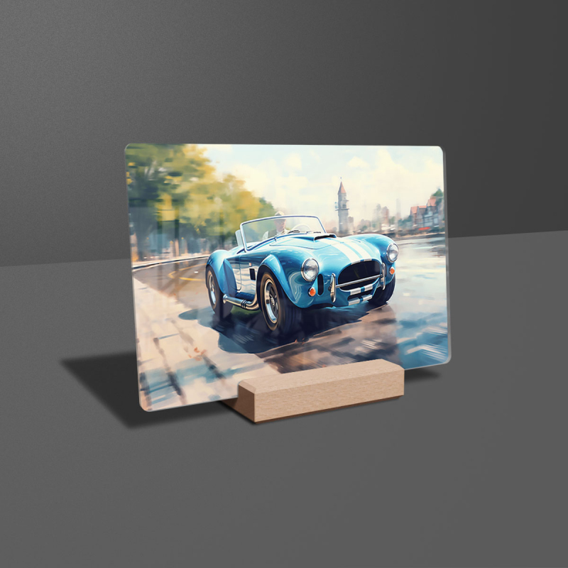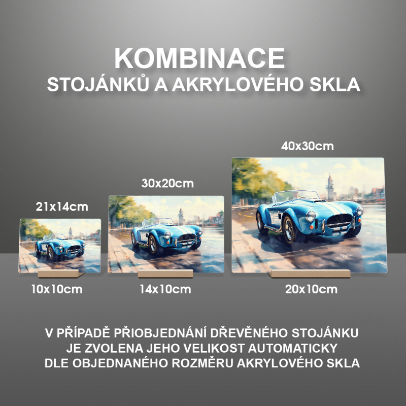 Na produktovém fotu vyobrazena nejoblíbenější varianta akrylového skla 14x21/21x14cm a dřevěný stojánek 10x10cm.