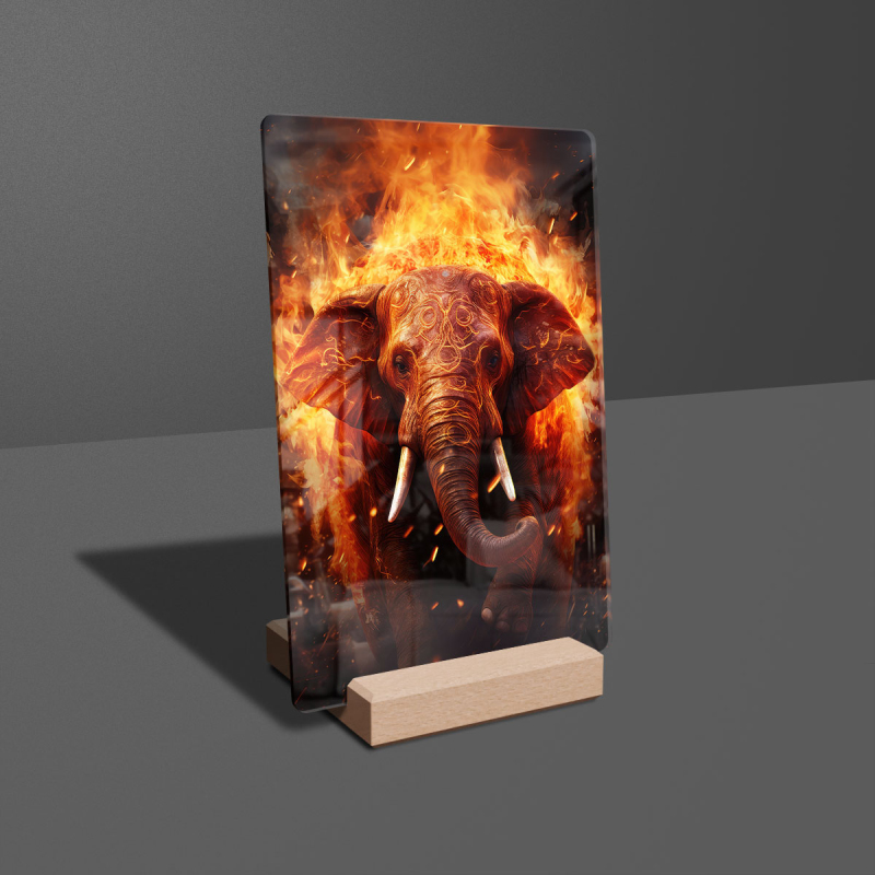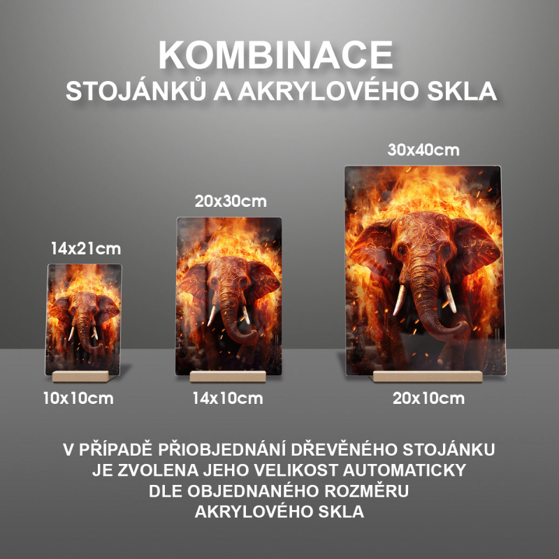 Na produktovém fotu vyobrazena nejoblíbenější varianta akrylového skla 14x21/21x14cm a dřevěný stojánek 10x10cm.