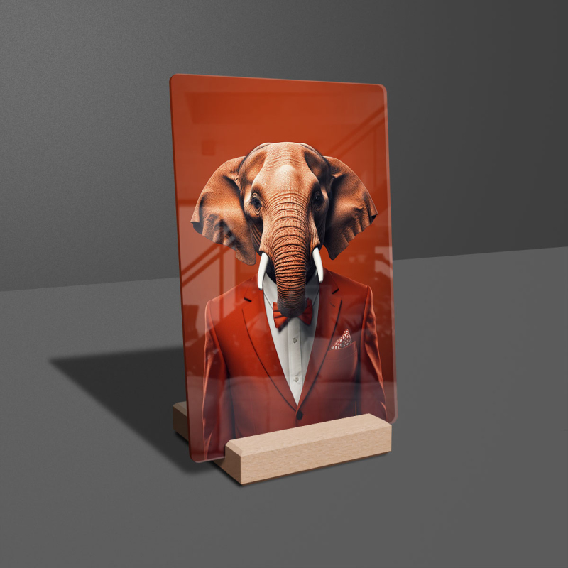Na produktovém fotu vyobrazena nejoblíbenější varianta akrylového skla 14x21/21x14cm a dřevěný stojánek 10x10cm.