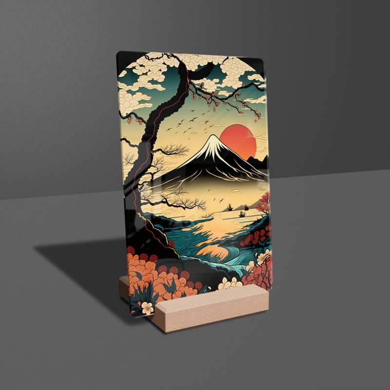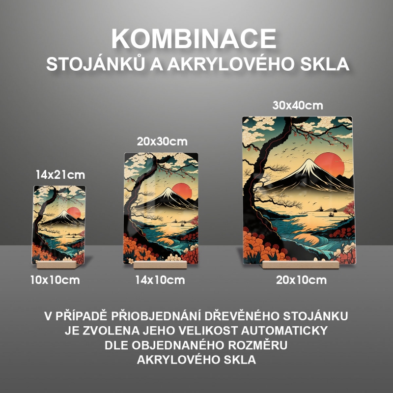 Na produktovém fotu vyobrazena nejoblíbenější varianta akrylového skla 14x21/21x14cm a dřevěný stojánek 10x10cm.