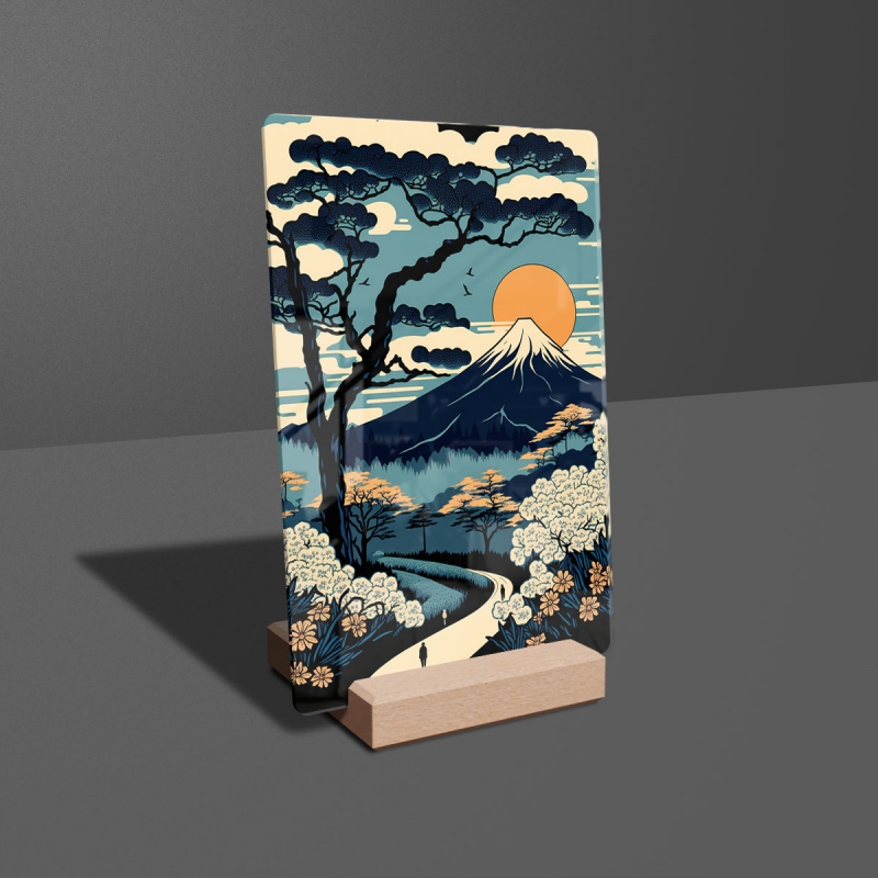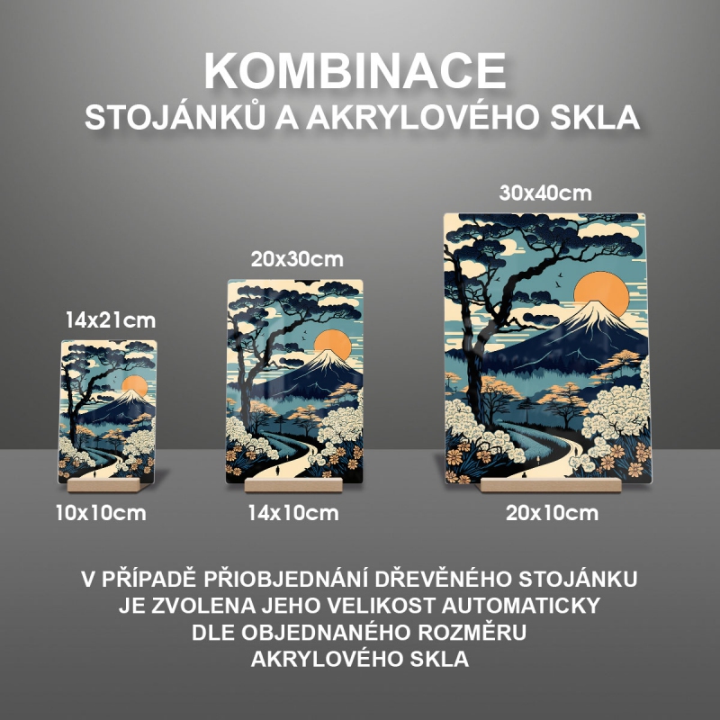 Na produktovém fotu vyobrazena nejoblíbenější varianta akrylového skla 14x21/21x14cm a dřevěný stojánek 10x10cm.