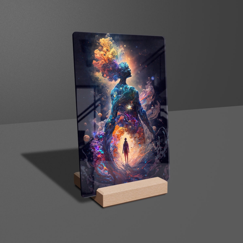 Na produktovém fotu vyobrazena nejoblíbenější varianta akrylového skla 14x21/21x14cm a dřevěný stojánek 10x10cm.