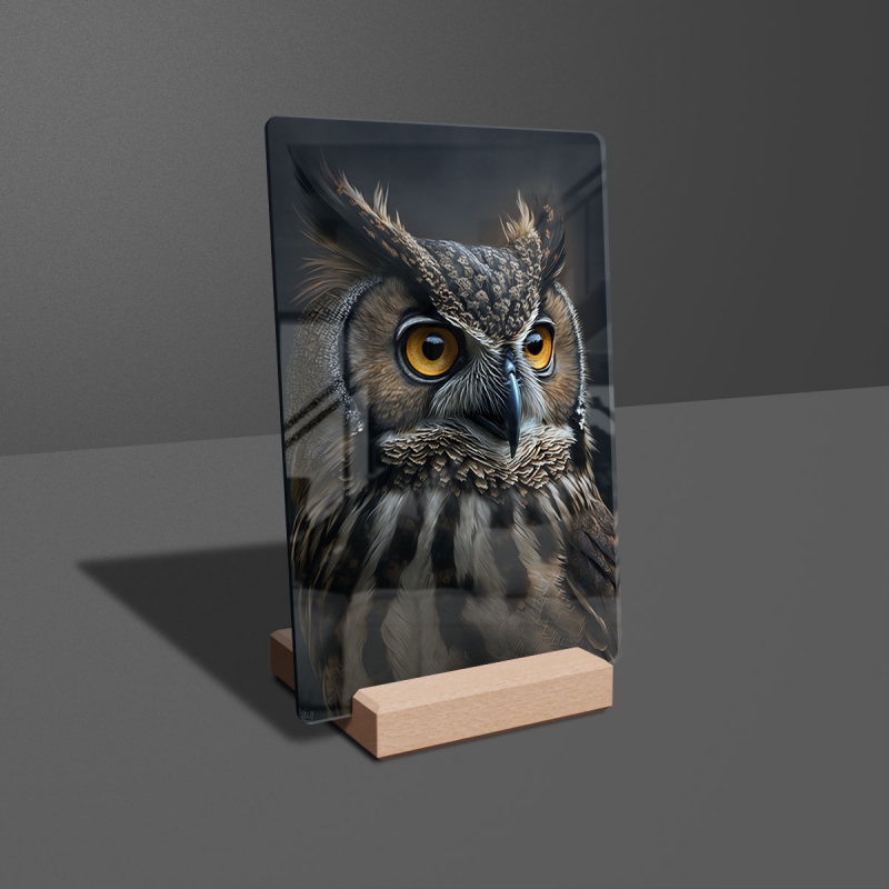 Na produktovém fotu vyobrazena nejoblíbenější varianta akrylového skla 14x21/21x14cm a dřevěný stojánek 10x10cm.