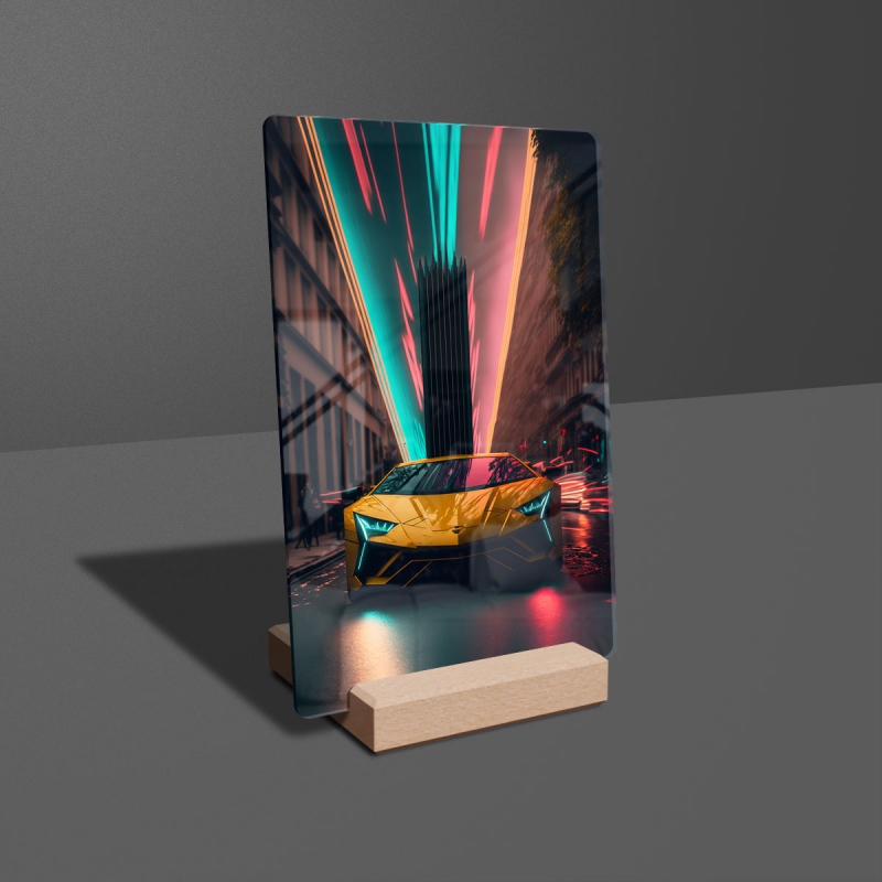 Na produktovém fotu vyobrazena nejoblíbenější varianta akrylového skla 14x21/21x14cm a dřevěný stojánek 10x10cm.
