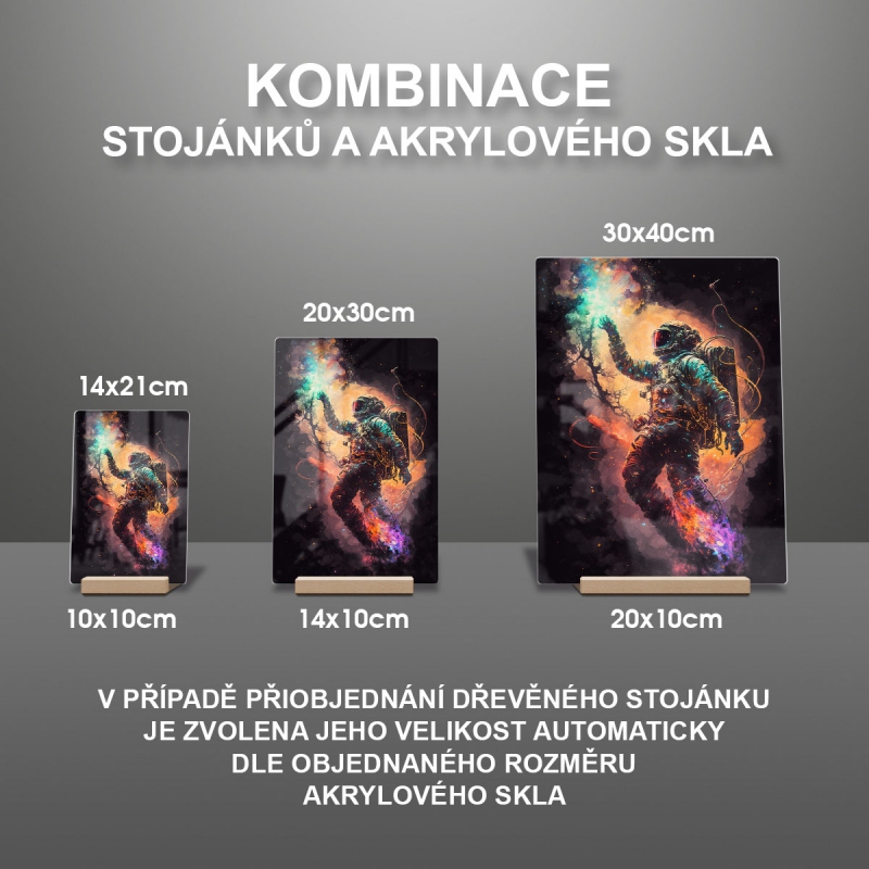Na produktovém fotu vyobrazena nejoblíbenější varianta akrylového skla 14x21/21x14cm a dřevěný stojánek 10x10cm.