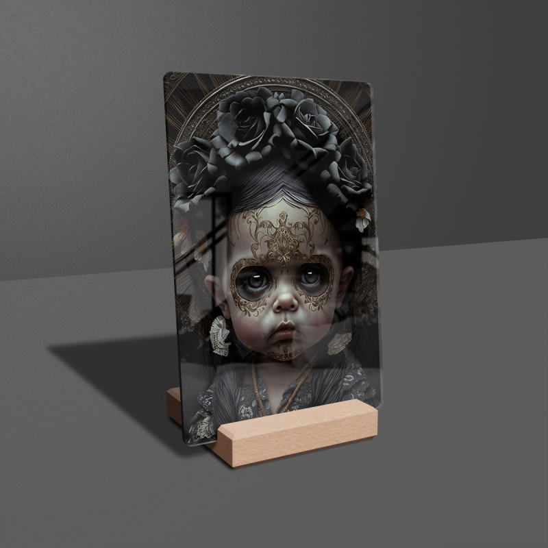 Na produktovém fotu vyobrazena nejoblíbenější varianta akrylového skla 14x21/21x14cm a dřevěný stojánek 10x10cm.