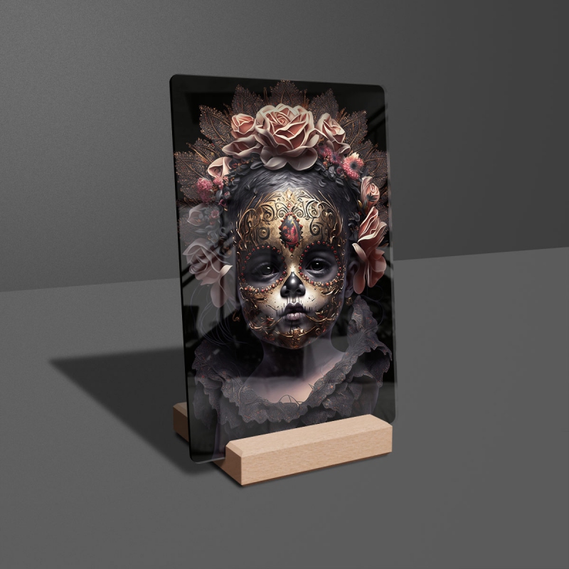 Na produktovém fotu vyobrazena nejoblíbenější varianta akrylového skla 14x21/21x14cm a dřevěný stojánek 10x10cm.