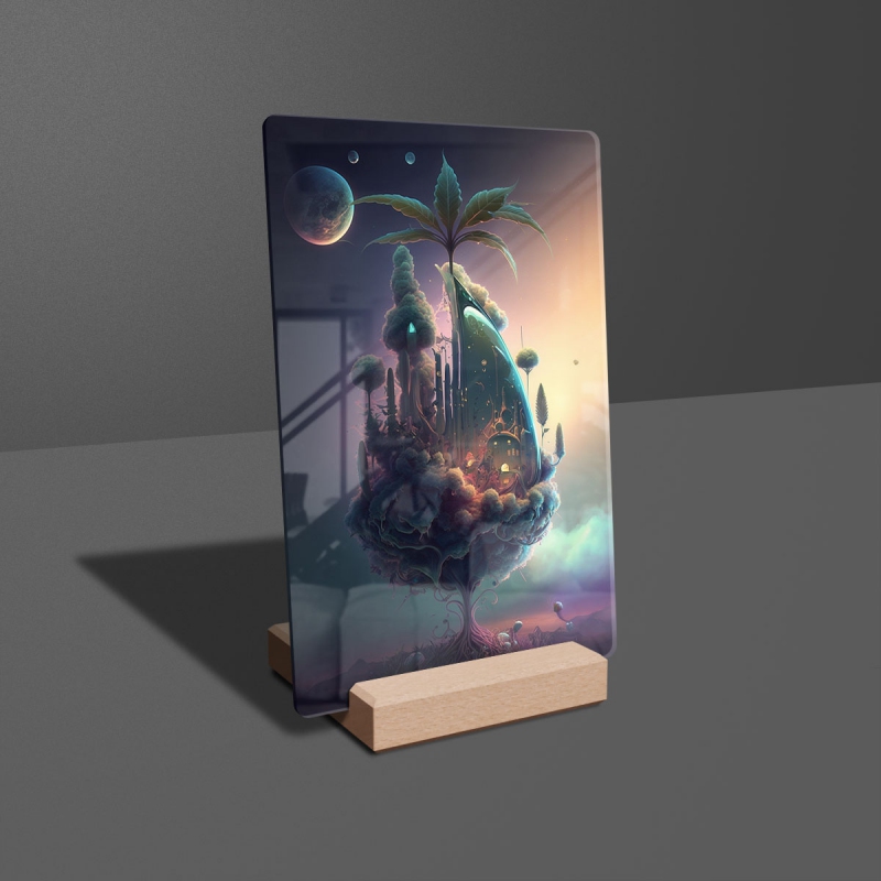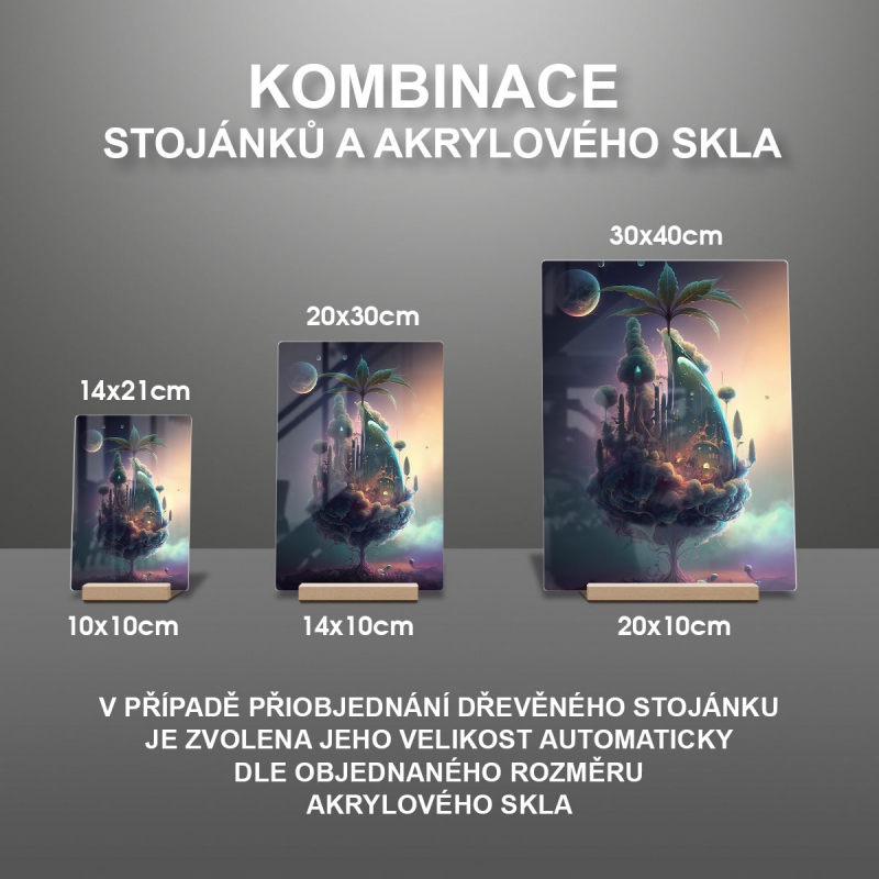 Na produktovém fotu vyobrazena nejoblíbenější varianta akrylového skla 14x21/21x14cm a dřevěný stojánek 10x10cm.