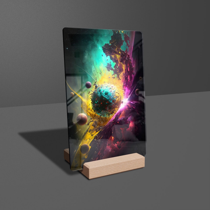 Na produktovém fotu vyobrazena nejoblíbenější varianta akrylového skla 14x21/21x14cm a dřevěný stojánek 10x10cm.