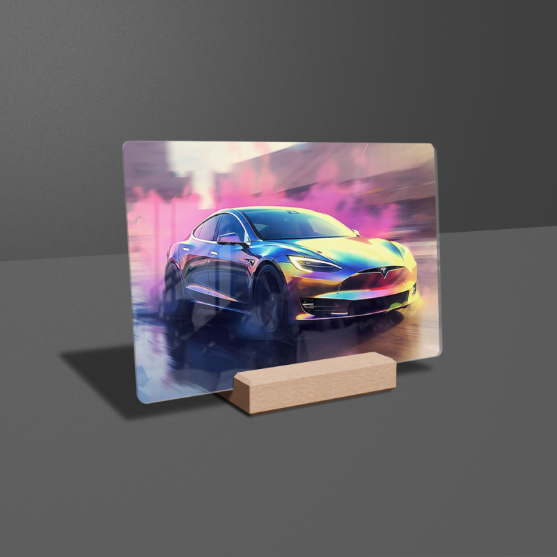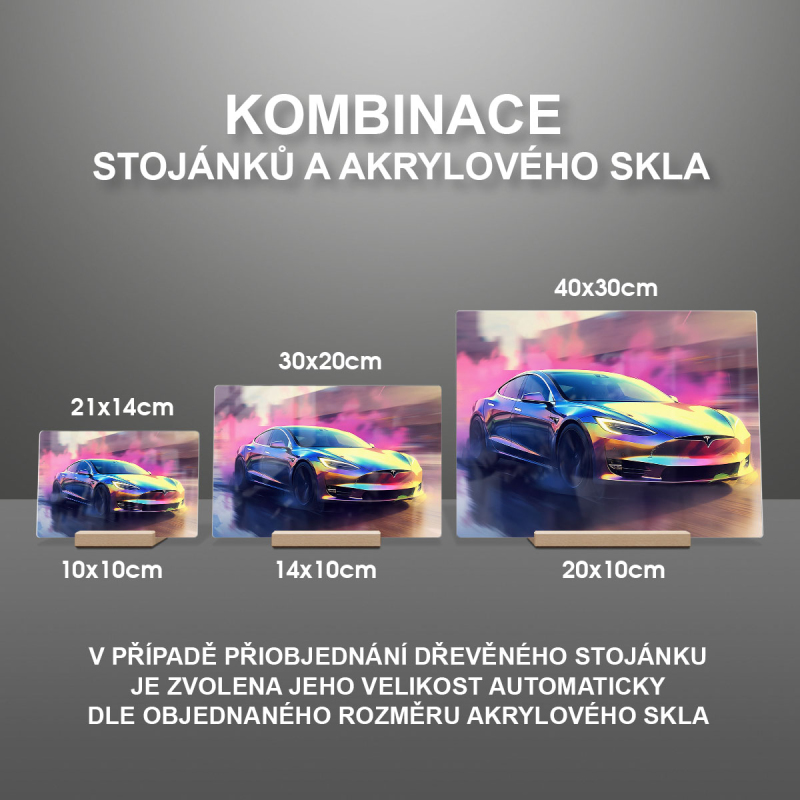Na produktovém fotu vyobrazena nejoblíbenější varianta akrylového skla 14x21/21x14cm a dřevěný stojánek 10x10cm.