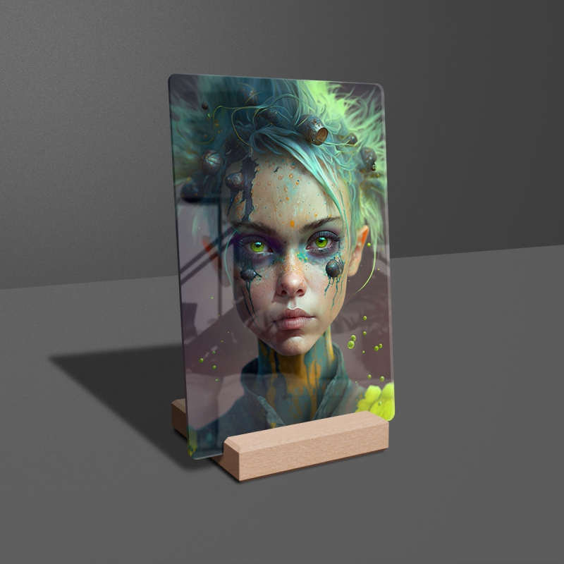 Na produktovém fotu vyobrazena nejoblíbenější varianta akrylového skla 14x21/21x14cm a dřevěný stojánek 10x10cm.