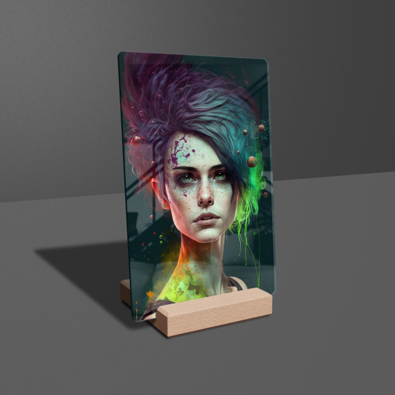 Na produktovém fotu vyobrazena nejoblíbenější varianta akrylového skla 14x21/21x14cm a dřevěný stojánek 10x10cm.