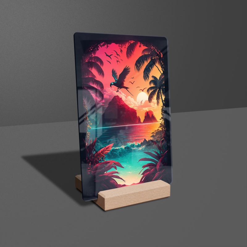 Na produktovém fotu vyobrazena nejoblíbenější varianta akrylového skla 14x21/21x14cm a dřevěný stojánek 10x10cm.