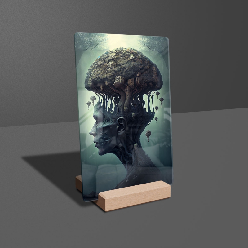 Na produktovém fotu vyobrazena nejoblíbenější varianta akrylového skla 14x21/21x14cm a dřevěný stojánek 10x10cm.
