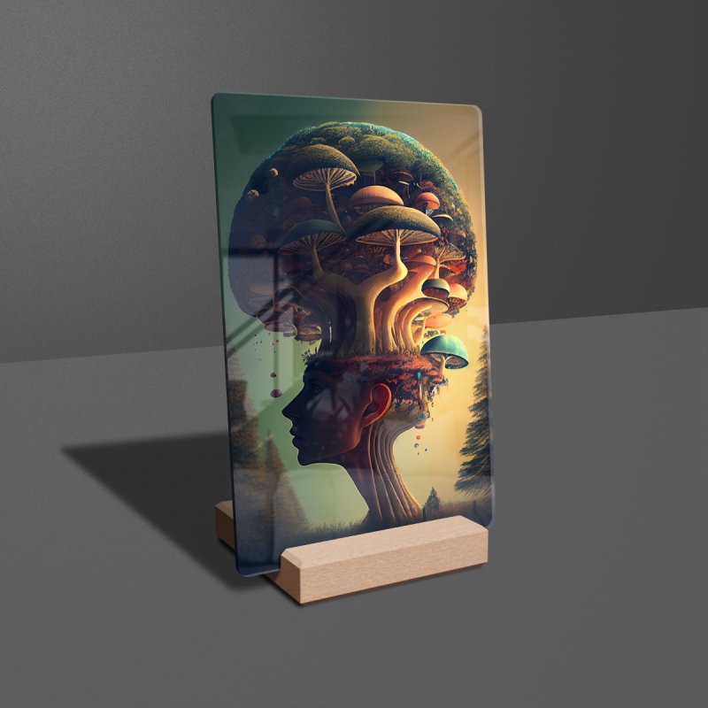 Na produktovém fotu vyobrazena nejoblíbenější varianta akrylového skla 14x21/21x14cm a dřevěný stojánek 10x10cm.