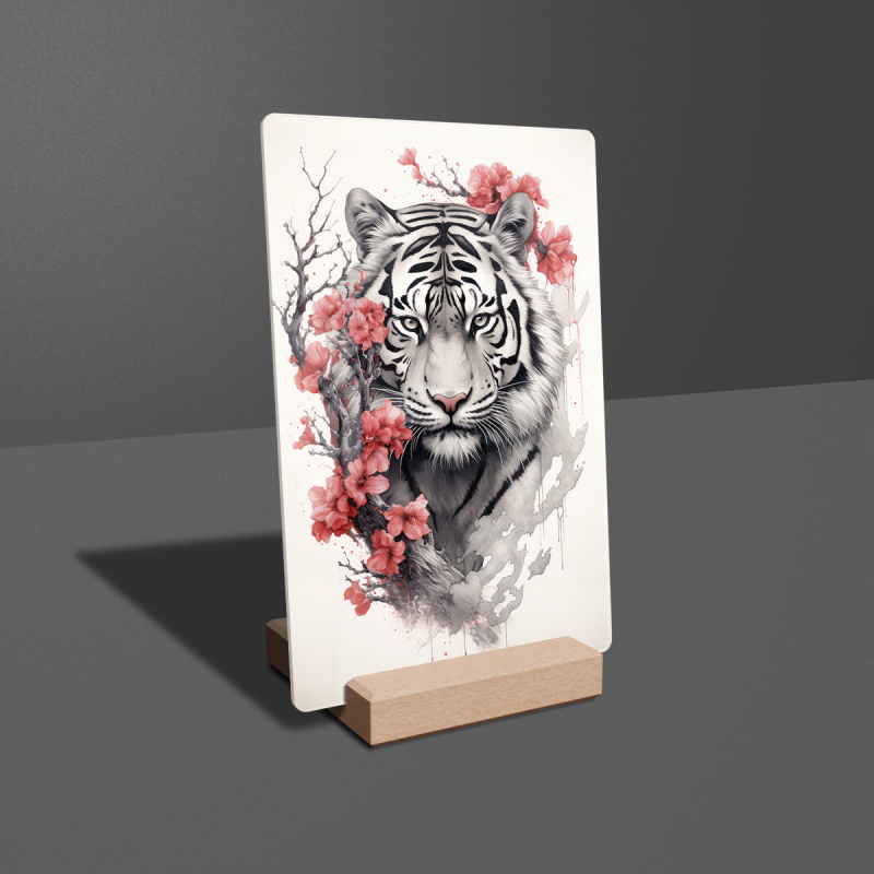 Na produktovém fotu vyobrazena nejoblíbenější varianta akrylového skla 14x21/21x14cm a dřevěný stojánek 10x10cm.