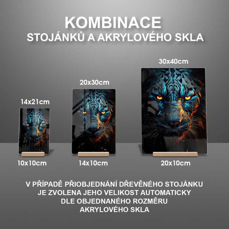 Na produktovém fotu vyobrazena nejoblíbenější varianta akrylového skla 14x21/21x14cm a dřevěný stojánek 10x10cm.