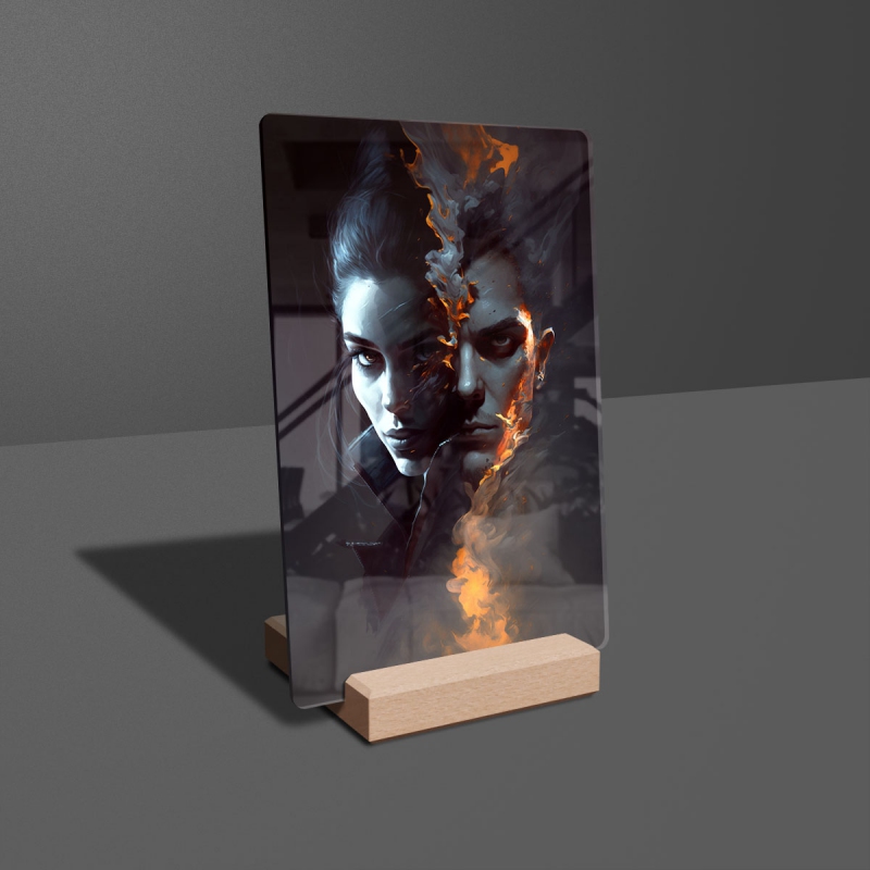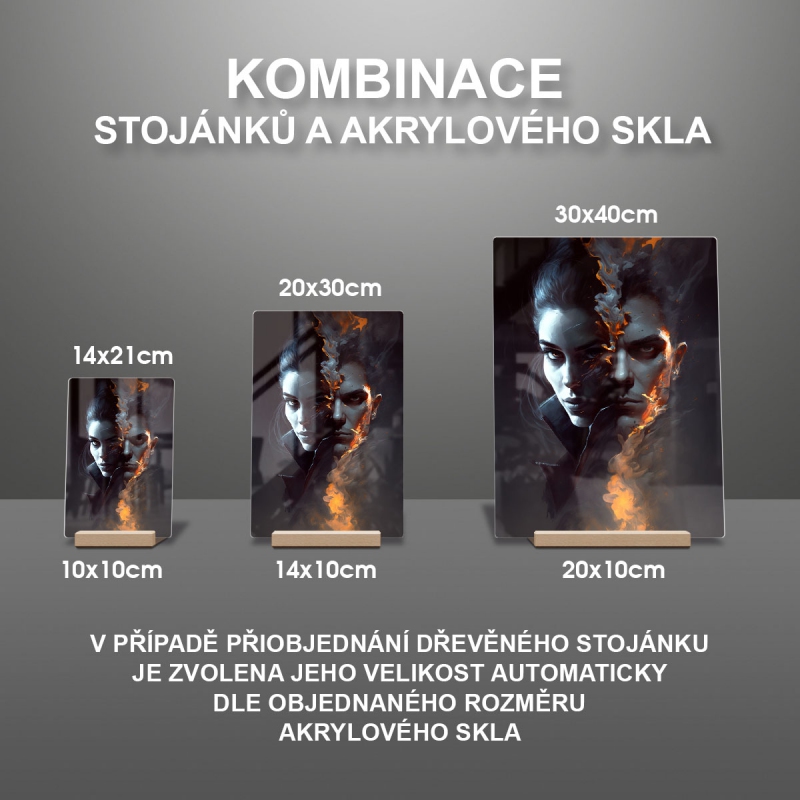 Na produktovém fotu vyobrazena nejoblíbenější varianta akrylového skla 14x21/21x14cm a dřevěný stojánek 10x10cm.