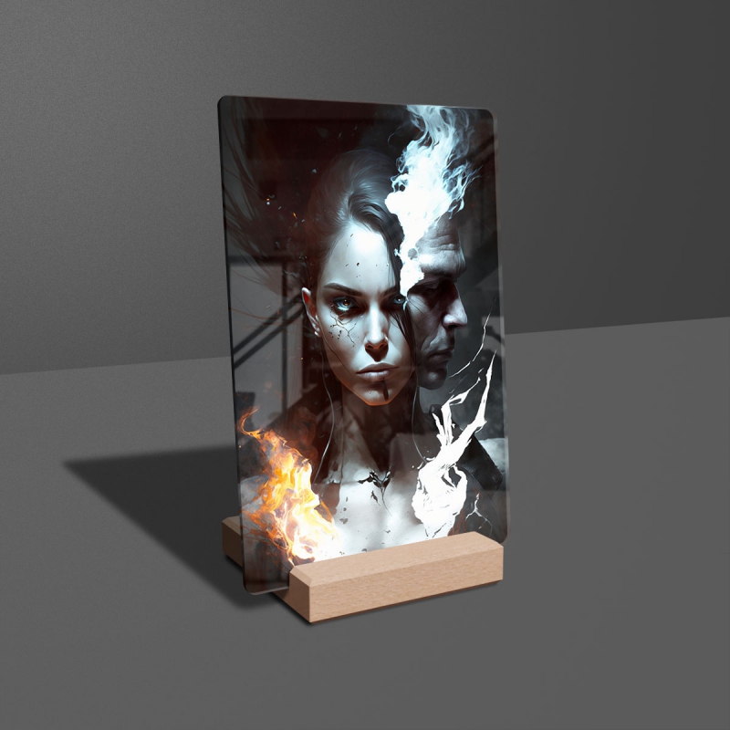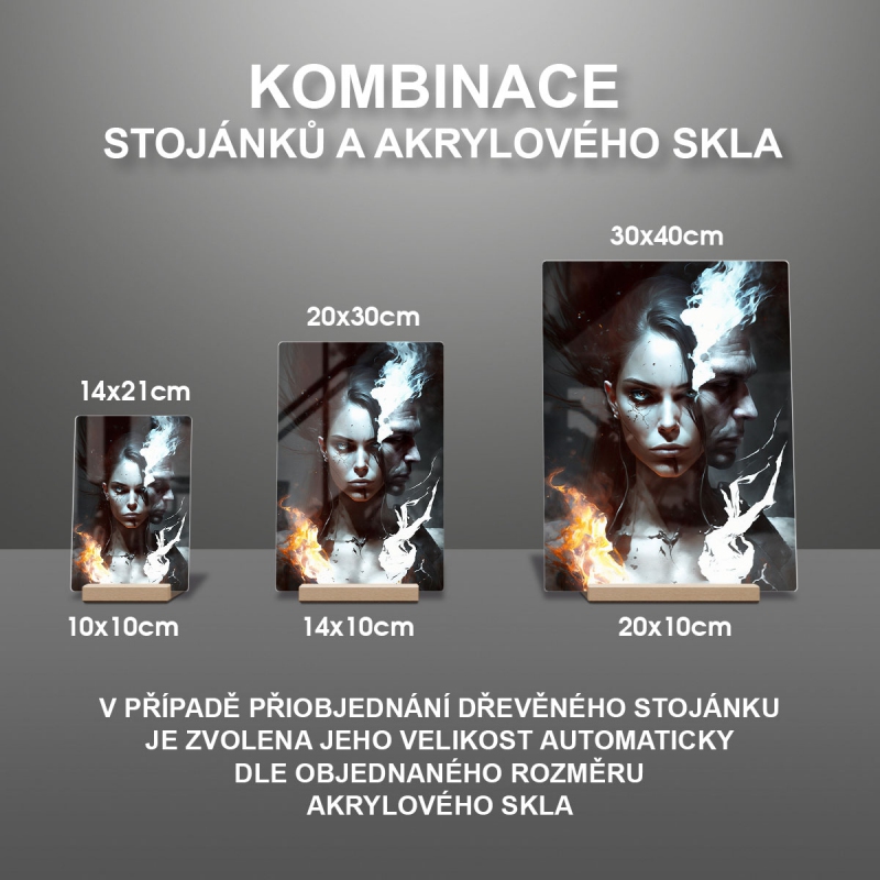 Na produktovém fotu vyobrazena nejoblíbenější varianta akrylového skla 14x21/21x14cm a dřevěný stojánek 10x10cm.
