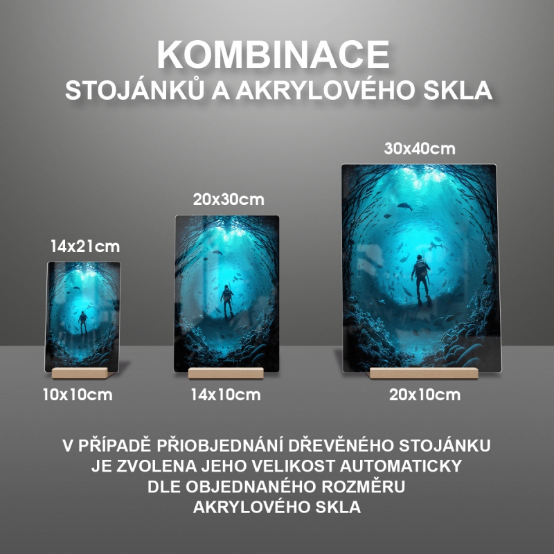 Na produktovém fotu vyobrazena nejoblíbenější varianta akrylového skla 14x21/21x14cm a dřevěný stojánek 10x10cm.