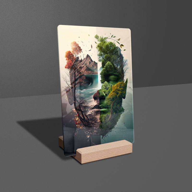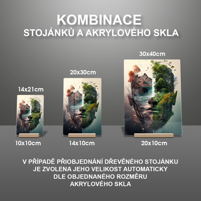 Na produktovém fotu vyobrazena nejoblíbenější varianta akrylového skla 14x21/21x14cm a dřevěný stojánek 10x10cm.