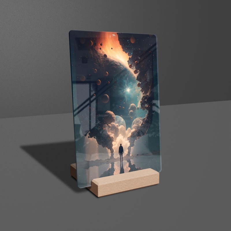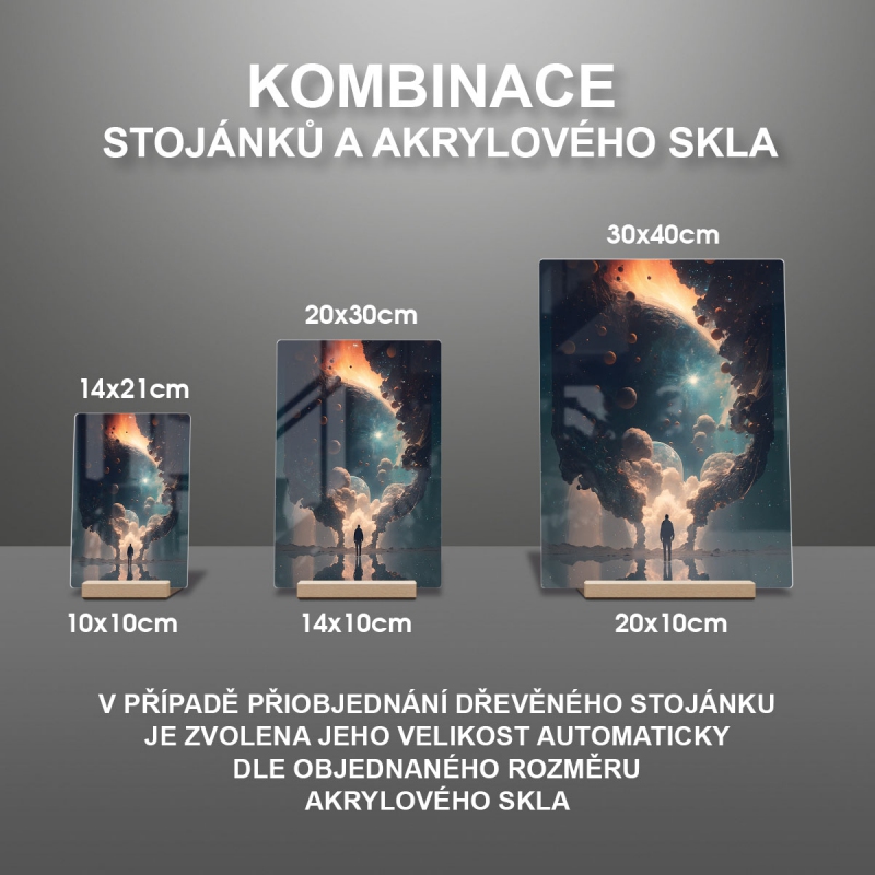 Na produktovém fotu vyobrazena nejoblíbenější varianta akrylového skla 14x21/21x14cm a dřevěný stojánek 10x10cm.