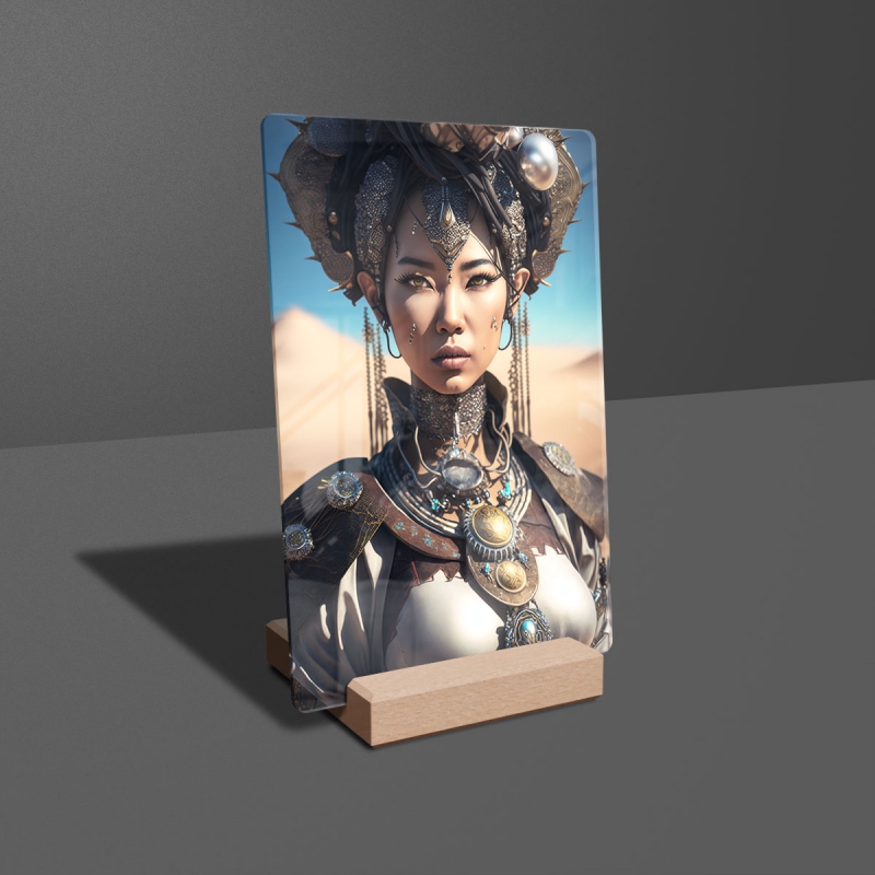 Na produktovém fotu vyobrazena nejoblíbenější varianta akrylového skla 14x21/21x14cm a dřevěný stojánek 10x10cm.