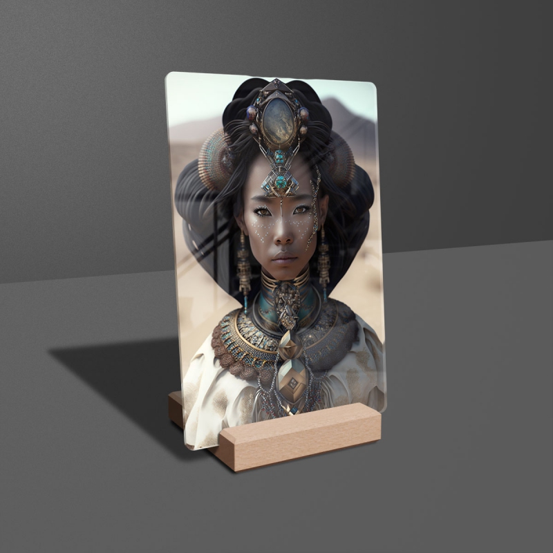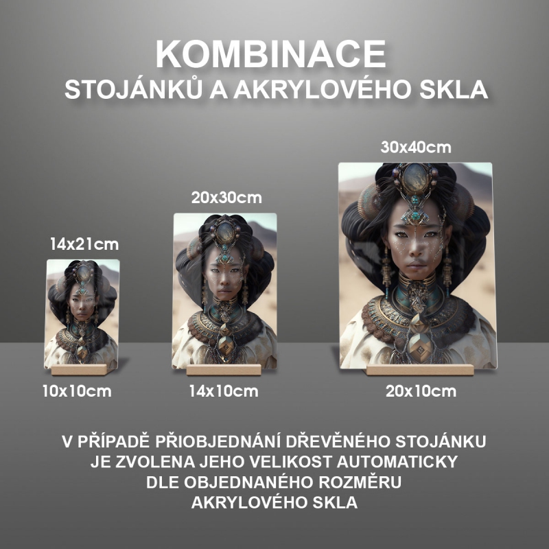 Na produktovém fotu vyobrazena nejoblíbenější varianta akrylového skla 14x21/21x14cm a dřevěný stojánek 10x10cm.