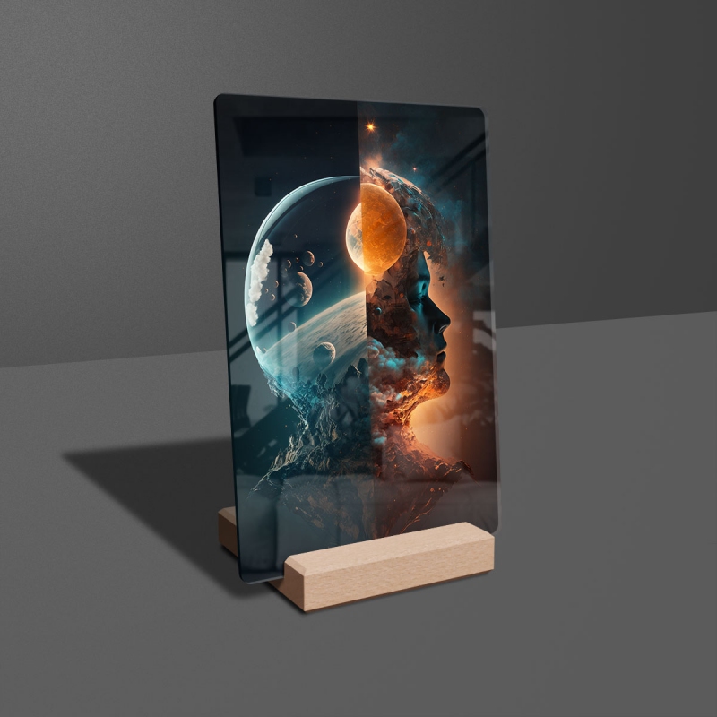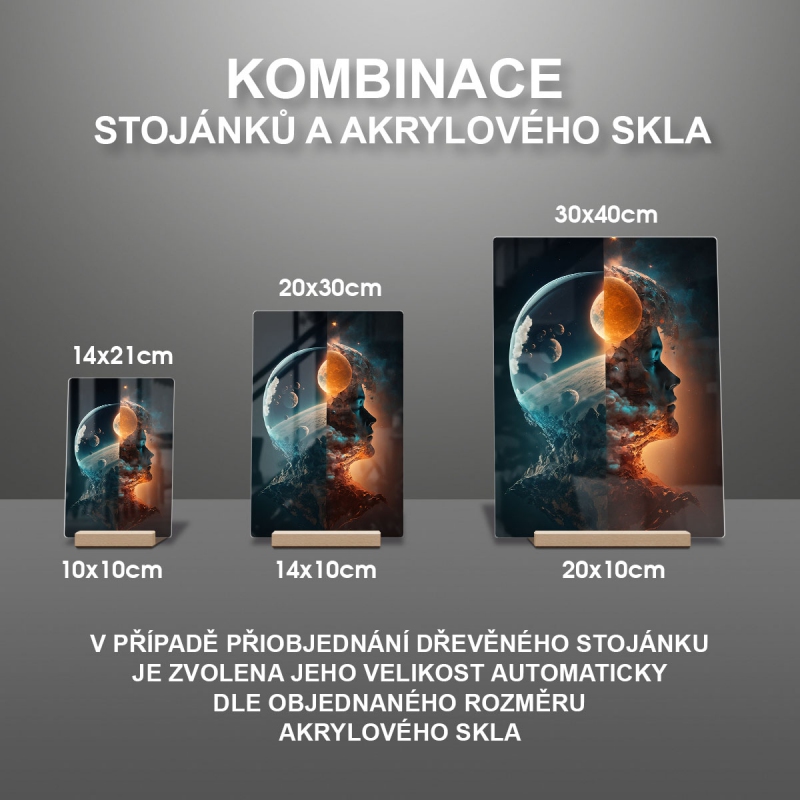 Na produktovém fotu vyobrazena nejoblíbenější varianta akrylového skla 14x21/21x14cm a dřevěný stojánek 10x10cm.